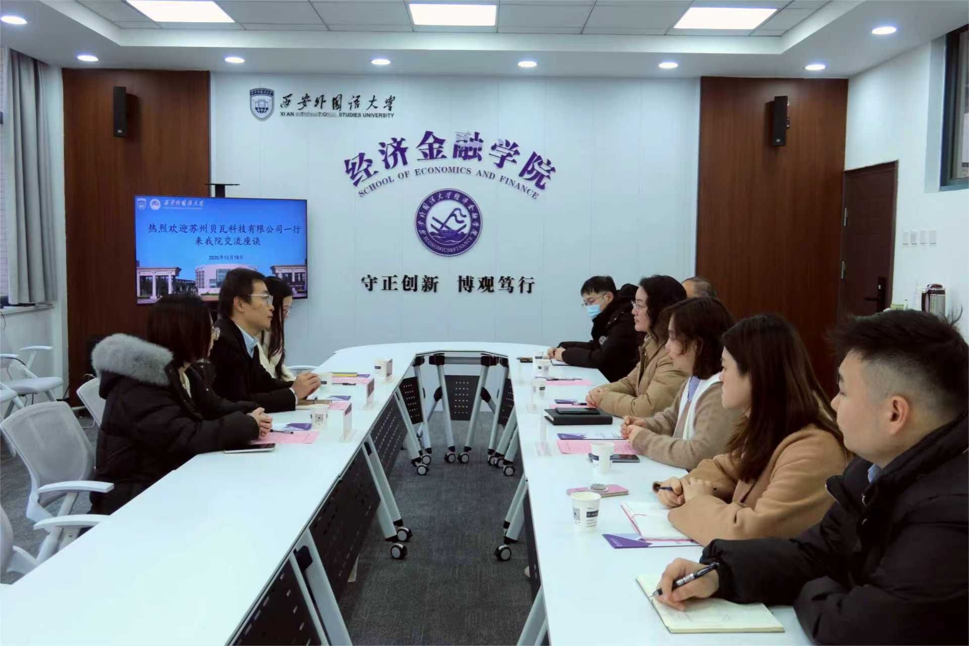 12月18日,经济金融学院与苏州贝瓦科技有限公司在教学楼E303会议室召开校企交流座谈会。苏州贝瓦科技有限公司市场总监杨洁、人事专员潘洁、海外媒体运营刘鑫月与学院党委书记邓雯、党委副书记尚瑞,学院教授党军,2022级辅导员王瑾、依斯坎达尔及研究生辅导员张亮参加座谈会。