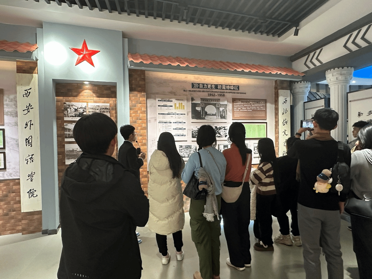 西安外国语大学长安校区,现代化的教学设施、浓郁的学术氛围与兼具传统韵味的校园环境给团员们留下深刻印象,大家对学校的办学环境给予高度评价。随后,交流团走进校史馆,通过珍贵的史料文献、实物展品和多媒体演示,系统了解了西安外国语大学的发展历程、学科建设成果及重大历史事件,对学校在国际化人才培养、中外文化交流等方面的突出贡献表示赞赏。