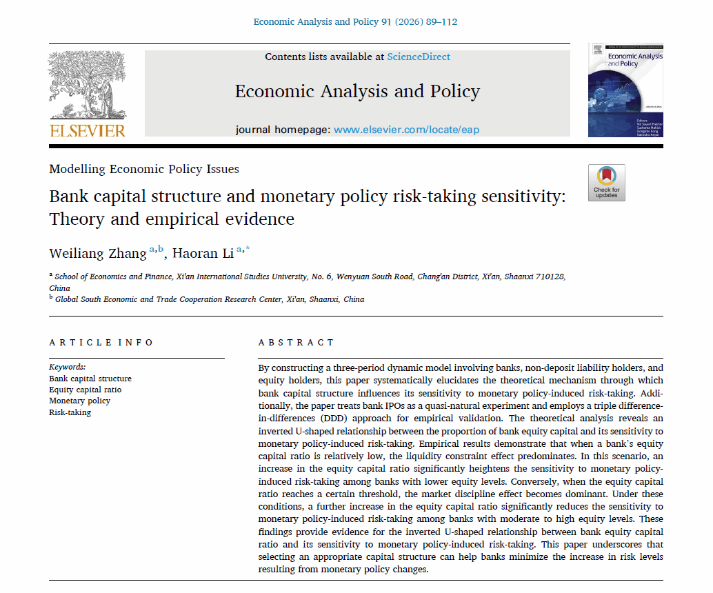 引用方式:Zhang, Weiliang. & Li, Haoran. (2026), "Bank capital structure and monetary policy risk-taking sensitivity: Theory and empirical evidence", Economic Analysis and Policy, Vol. 91, Pages. 89-112.