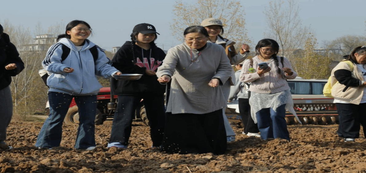 田间地头,大一同学们在当地农技员指导下,认真学习小麦播种、施肥、灌溉等农耕技能。大家分工协作,有的挥锹铲土整畦,有的弯腰播撒麦种,有的跟着学习操作农机。亲身劳作中,大家真切体会农业劳动的艰辛与价值,明白“一粥一饭来之不易”。协作交流间,陌生的彼此渐渐熟络,集体凝聚力在汗水中悄然增强。一畦畦整齐田垄向远方延伸,秋日大地重归平整,金色麦种深埋沃土,静待来年萌发。